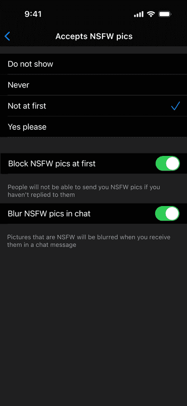 Some platforms, for example, Instagram, hide pictures sent by those one is not following by default — that way, users can decide if they want to reveal what may be a problematic image from an unknown other. Alternatively, some platforms, such as Tinder, do not allow pictures or videos to be sent at all. On the other hand, some do not mind receiving NSFW content, especially on dating apps where they may see it as part of facilitating sexual encounters with those they interact with. Some platforms, such as Grindr, recognise variation in whether users would like to receive NSFW content — they offer three profile options for communicating one's openness to receiving NSFW pictures, "yes please", "not at first" and "never". While this allows users to explicitly consent, or not, it relies on someone being proactive enough to check before deciding whether to send NSFW content.