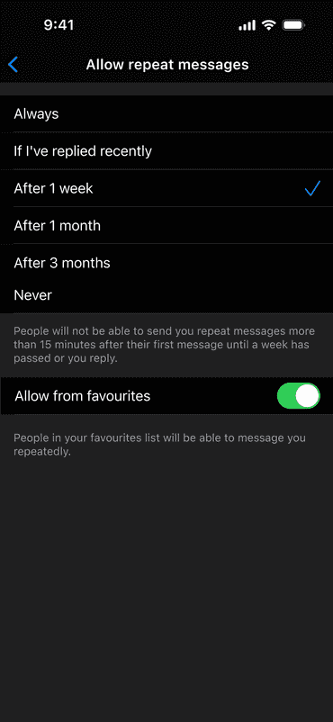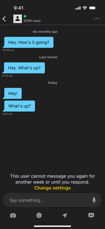 A common complaint on dating apps such as Grindr that do not have "matching" processes is receiving repeated messages from the same user. This concept allows users to limit how often people can message them. There’s an option to allow repeat messages from people in their favourites.