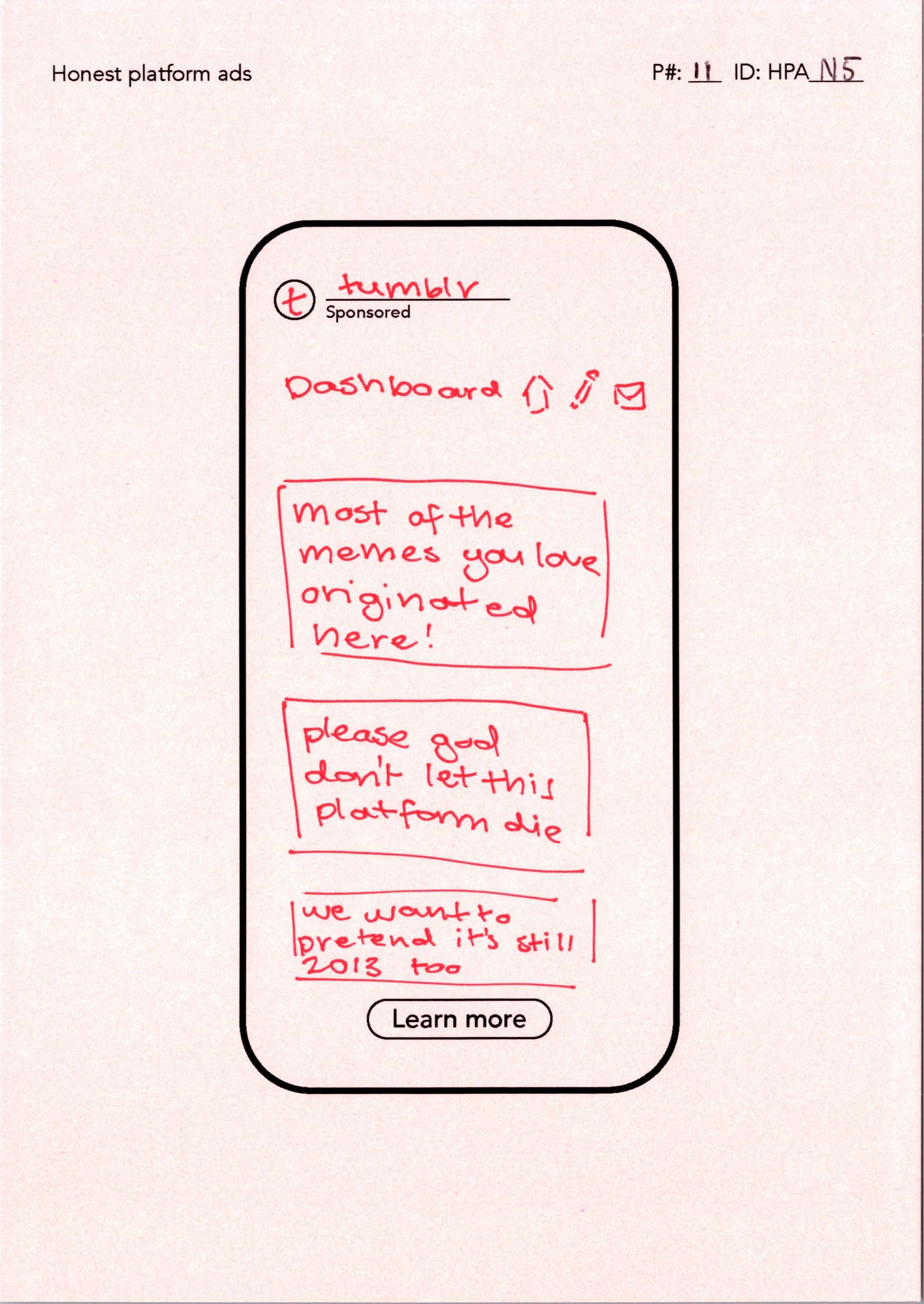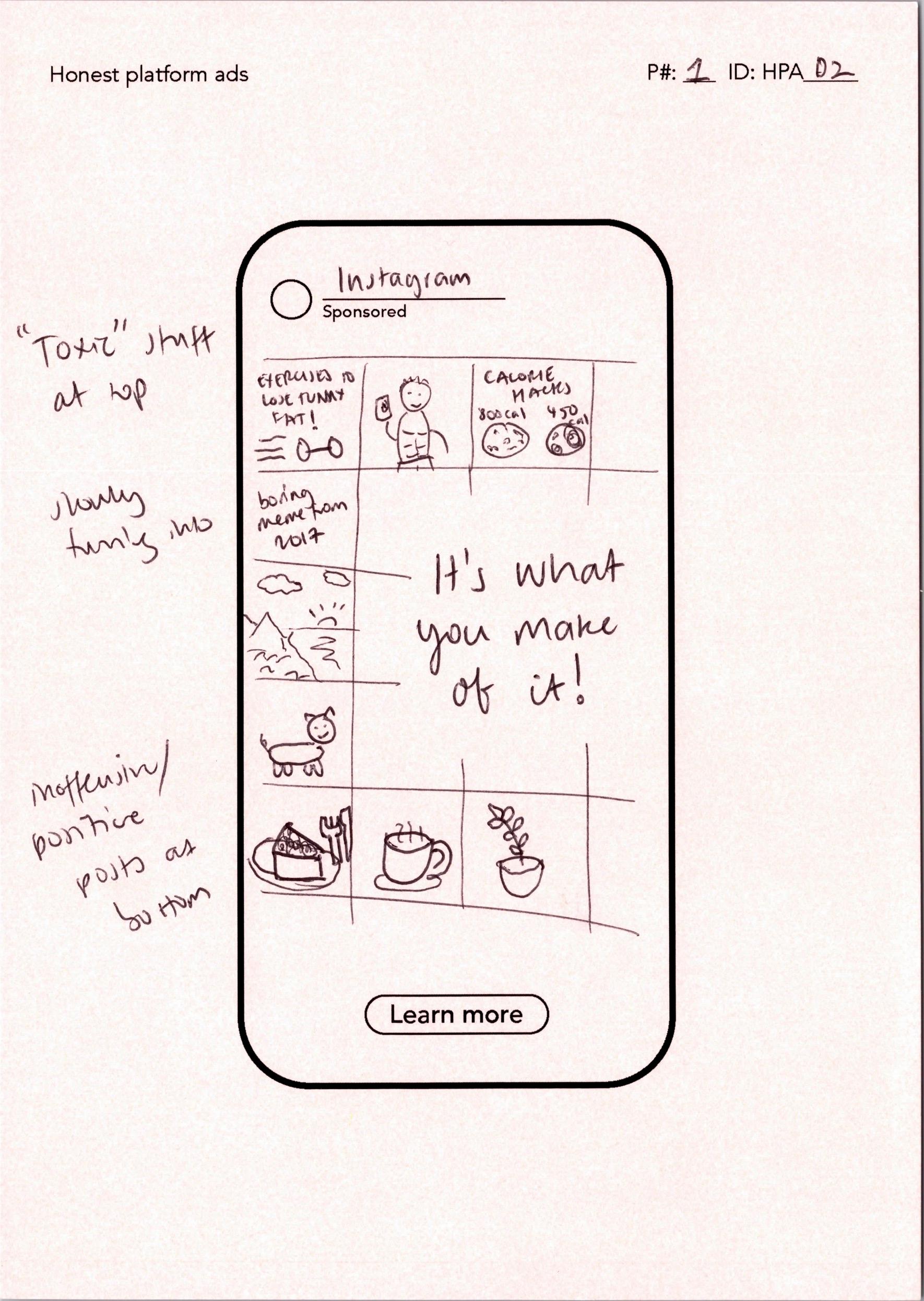 While other probes focus on how participants use social platforms (at an account level, at specific moments, or throughout a day), this probe provides a way to reflect on perceptions of the platform as a whole. It does so by instructing participants to create "honest" ads that reveal the realities of using them through satire. The idea behind the probe is that satire is a powerful and creative tool for communicating critical perceptions and unspoken realities. While participants were told they could highlight both positive and negative aspects of platforms, the ads they created were almost exclusively critical.