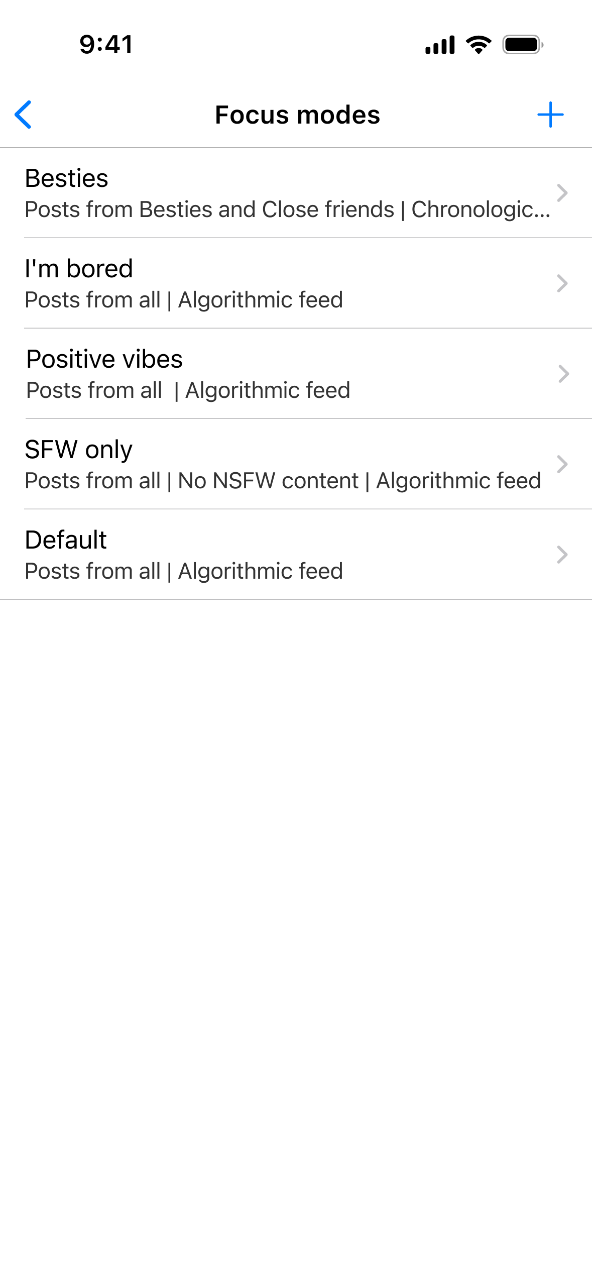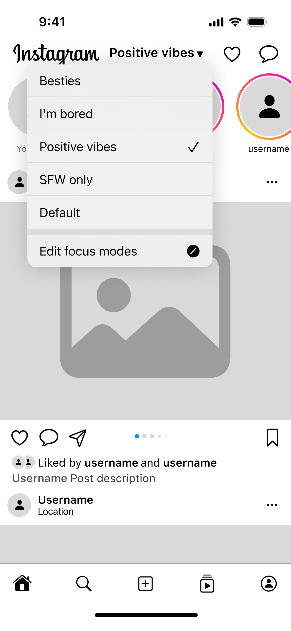 The mockups on the right show how this could be implemented on Instagram. The left one shows a new control at the top of the feed to select the current feed, while the right shows the interface to edit focus modes.