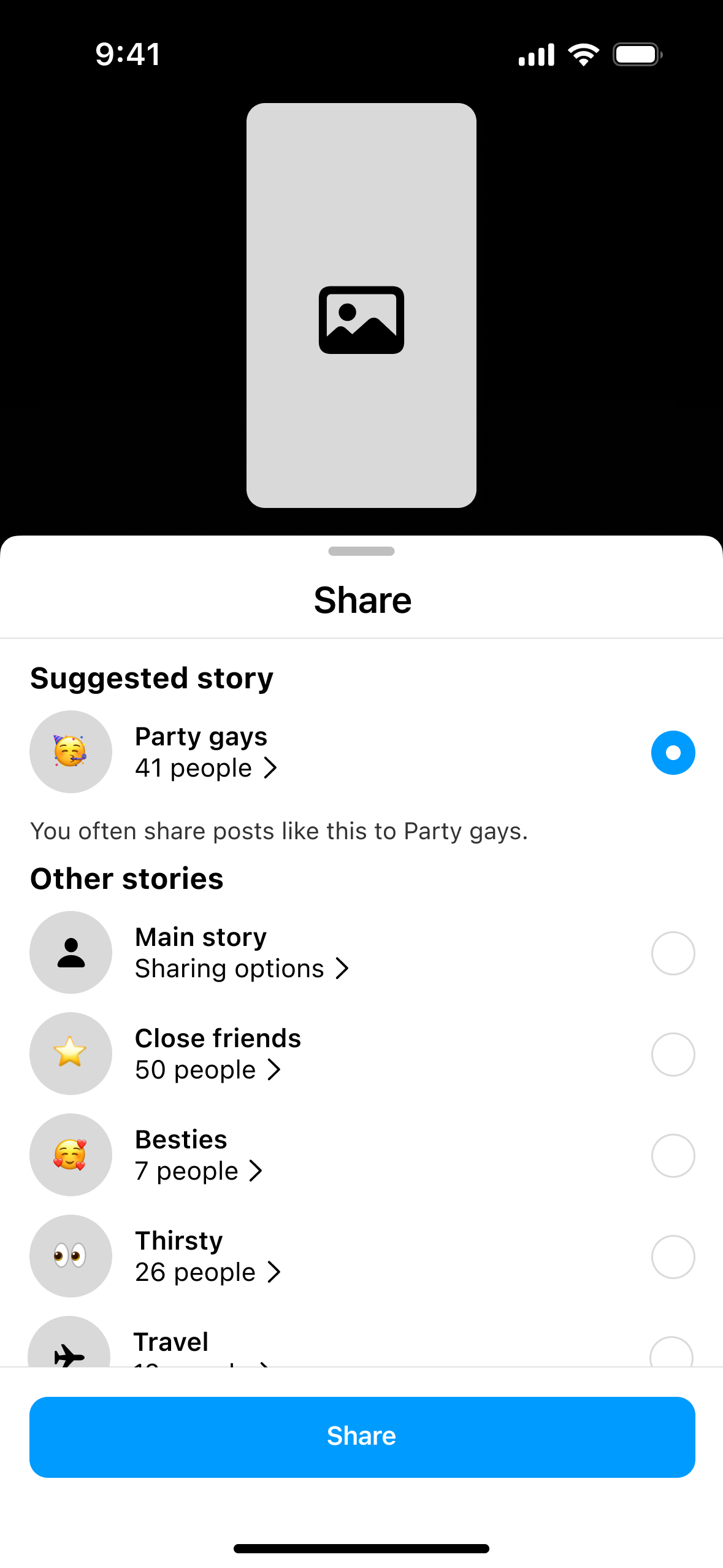 The concept Smart social circles provides an example of a way to give people flexibility over audiences that extends the binary Close Friends story feature on Instagram to allow for multiple lists. The first image on the right shows the ability to share stories to predefined lists while the second image shows how to edit lists. To reduce the burden of maintaining lists, people are suggested to be included.
