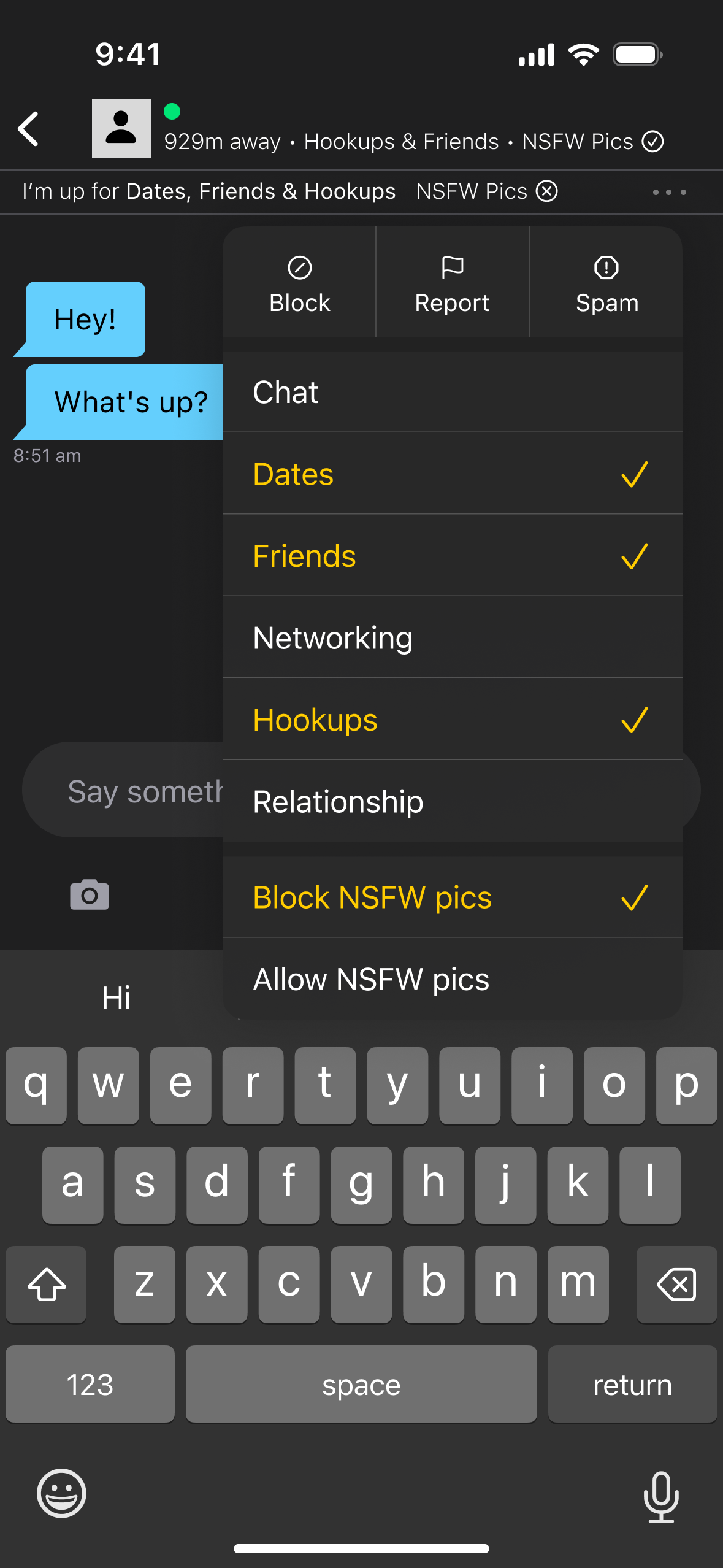 People often don't read bios, or remember what people have said they are looking for. As a result, their preferences ought to be displayed in the chat where it is harder to miss. The mockup on the right shows how this could be done — the preferences of the other person are displayed alongside their details (see the top line where it indicates the other person is looking for "Hookups & Friends").